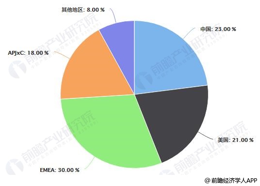 从大数据储量分布情况来看,美国大数据储量占比为21%,EMEA(欧洲、中东、非洲)占比为30%,中国地区占比为23%。