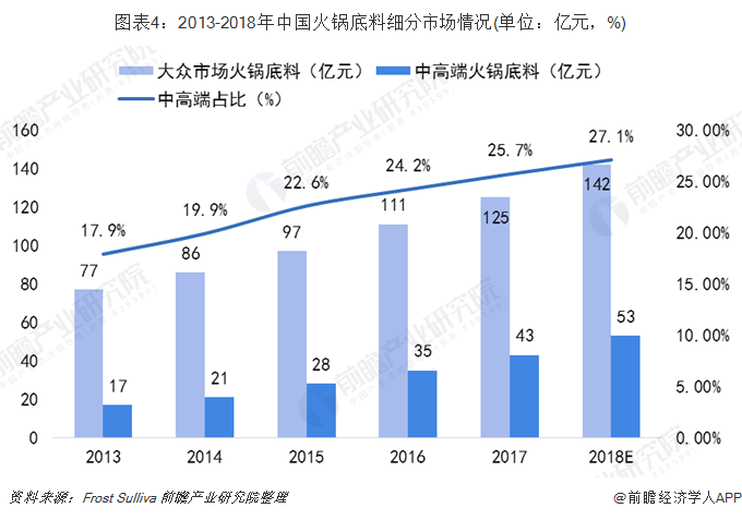 从细分市场来看,我国中高端火锅底料市场占比持续扩大,据Frost Sulliva统计数据显示,2018年,我国火锅底料市场中,大众市场火锅底料市场规模约142亿元左右,中高端火锅底料市场规模约53亿元,中高端火锅底料市场份额约为27.1%。