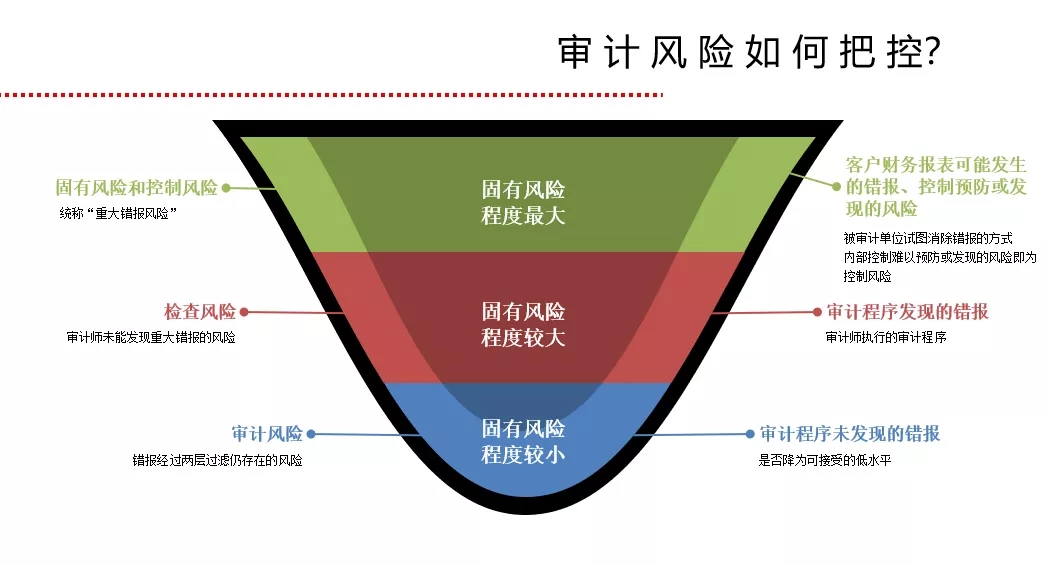那么说到审计风险,我们需要知道如何管控风险,审计风险=重大错报风险×检查风险,就像一个漏斗,企业的风险通过企业设计的内部控制会被降低一部分,在通过注册会计师的审计之后,又会降低一部分,最终经过两层过滤剩下的就是注册会计师可接受的风险,也是我们最终未发现的错报风险。