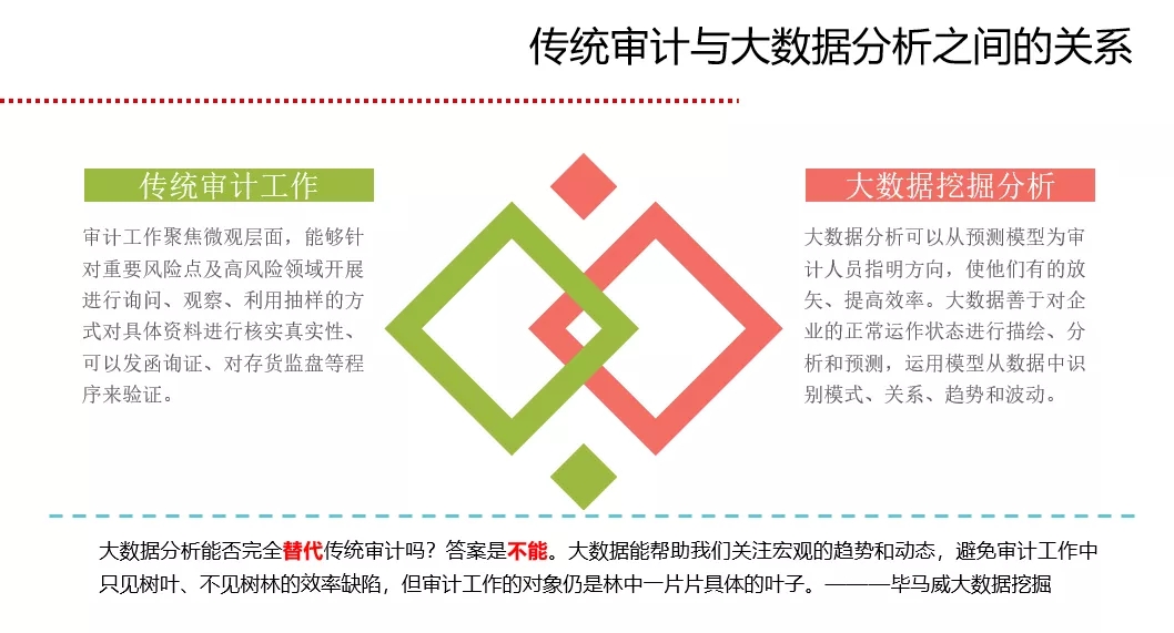 那么随着科技进步,审计方法也会有所变化;比如大数据时代,我们需要利用大数据分析等方法来提高审计效率和质量。但是,大数据分析能否完全替代传统审计呢?答案是不能。“毕马威大数据挖掘”曾说过这样一段话:“大数据能帮助我们关注宏观的趋势和动态,避免审计工作中只见树叶、不见树林的效率缺陷,但审计工作的对象仍是林中一片片具体的叶子”。