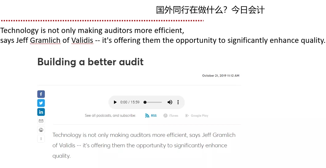 国内如火如荼,那么国外审计师是什么情况呢?查看了“今日会计”的国外网站,也有一些关于技术对审计影响的文字。比如这篇很简单文章,如何建立一个很好的审计,技术不仅给审计人员带来效率提升,还会很大程度上提高审计质量。