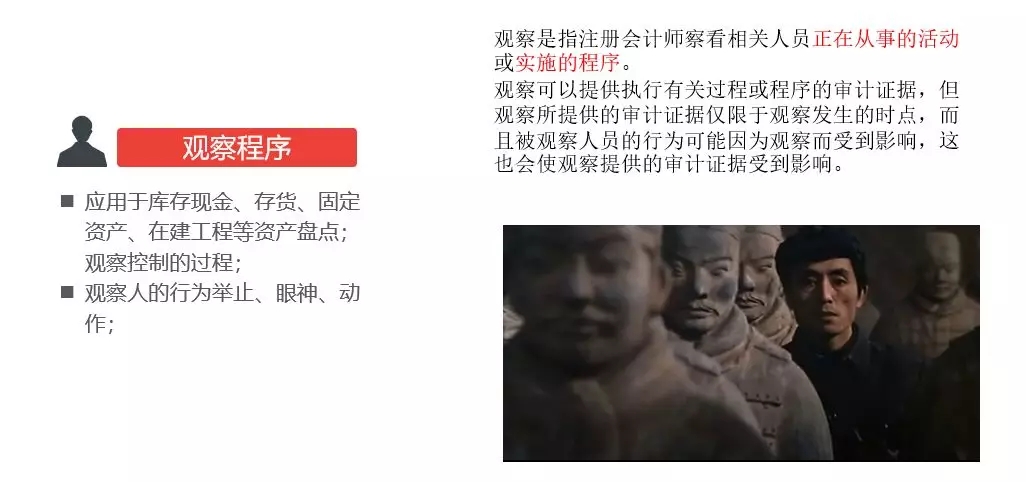 观察是指注册会计师察看相关人员正在从事的活动或实施的程序。观察可以提供执行有关过程或程序的审计证据,但观察所提供的审计证据仅限于观察发生的时点,而且被观察人员的行为可能因为观察而受到影响,这也会使观察提供的审计证据受到影响。从上述定义来看,观察程序可以广泛应用于库存现金、存货、固定资产、在建工程等资产盘点,观察其内部控制的过程,以及观察人的行为举止、眼神、动作等。