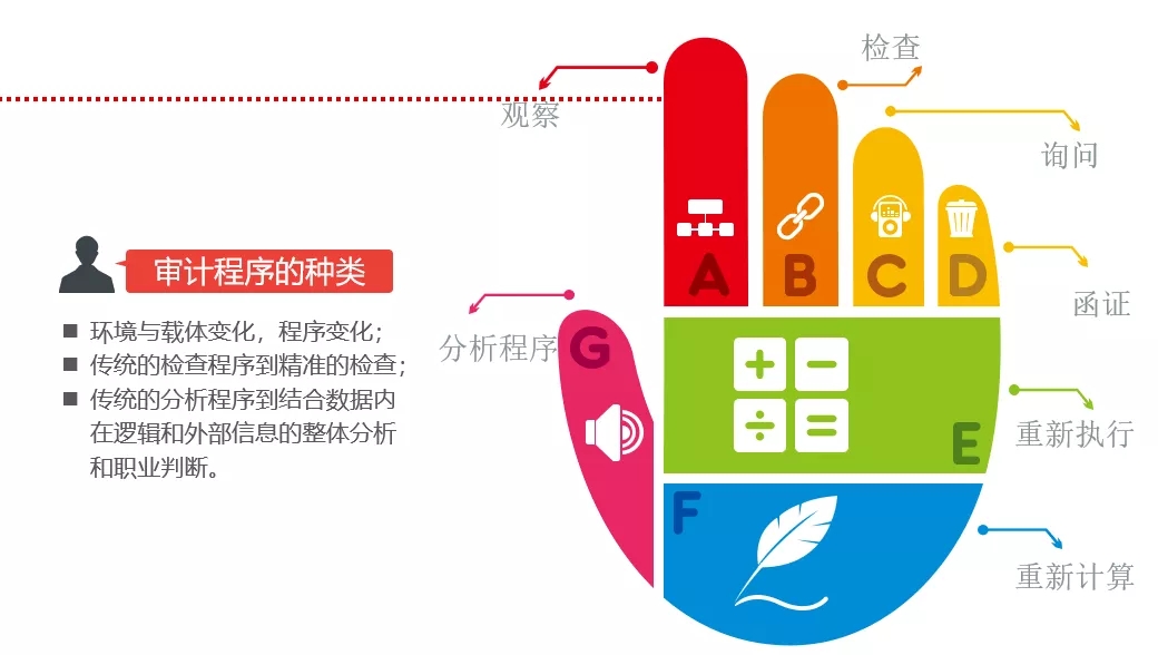 审计程序的种类包括观察、检查、询问、函证、重新执行、重新计算和分析程序,但随着环境与载体的变化,审计程序也会随着变化,比如科技进步而产生的IT审计、数据审计等;从传统检查文件和检查有形资产发展到大数据的精准检查;从传统的分析程序到结合数据内在逻辑和外部信息的整体分析和职业判断。