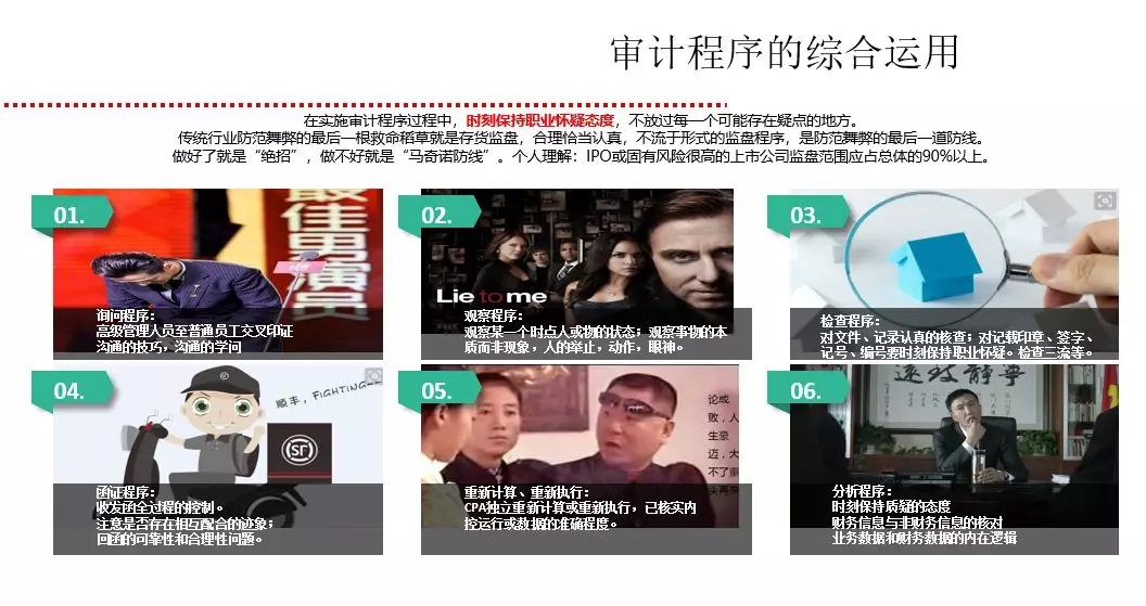 那么这些审计程序如何综合运用呢?我总结应该要做到以下六点。