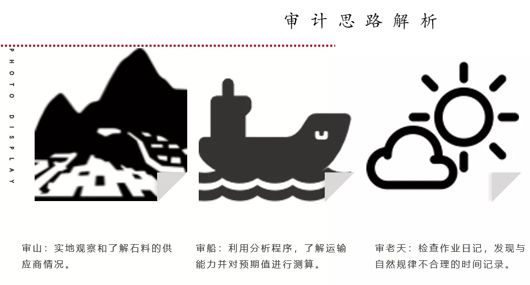 审计小结:审山、审船、审老天,不难看出主要是利用财务数据和非财务数据之间的逻辑关系发现了舞弊的问题。从这个案例不难得到一些启示,我们要跳出企业的账簿,要从内、外部情况分析入手,利用分析程序,在结合有效的检查、访谈、观察等程序来验证数据的合理性。那么舞弊的问题就能够迎刃而解。