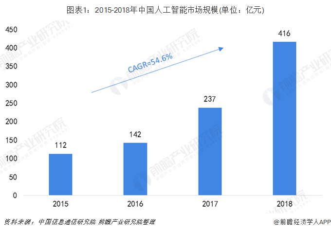 人工智能是近年来世界上发展最快的技术之一,人工智能及相关技术,如自动化、机器学习、自然语言处理、大数据分析以及机器人技术,在广泛的领域和行业中被采用。2015-2018年,中国人工智能市场规模逐渐扩大,据中国信息通信研究院统计数据显示,2015-2018年,中国人工智能市场规模的复合平均增长率为54.6%,截至2018年底,中国人工智能市场规模达416亿元。