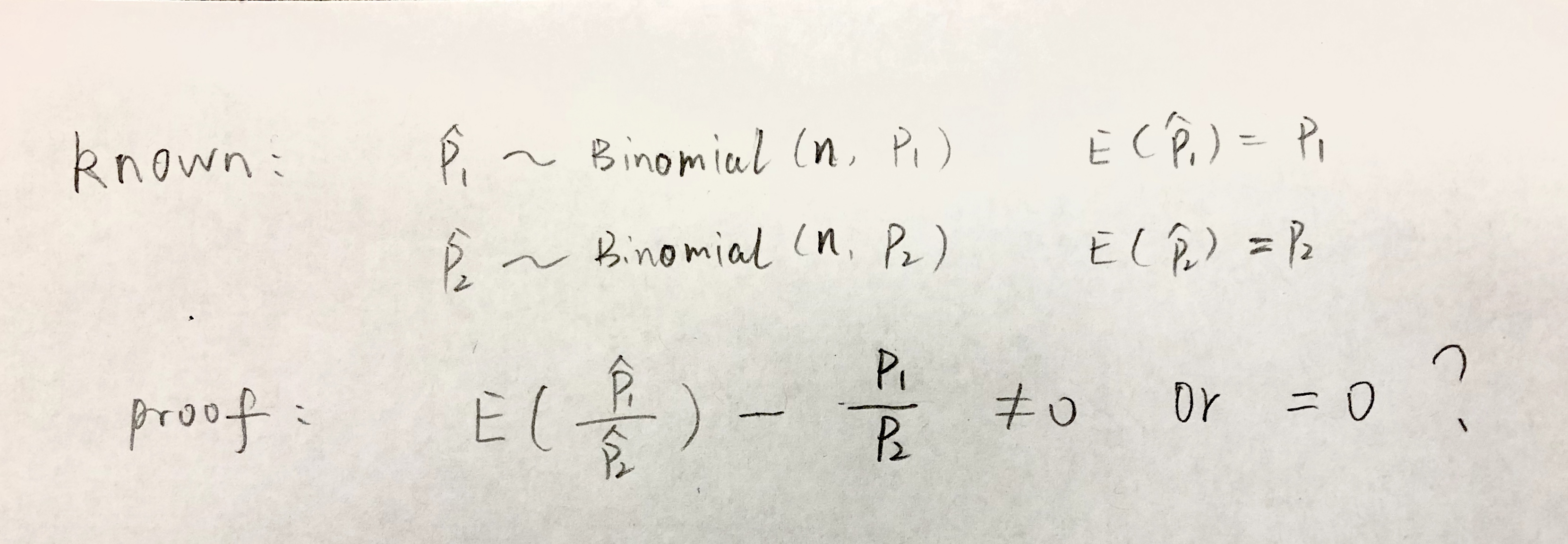 样本率p1、p2服从二项分布,求证p1/p2它们的期望是有偏估计。如图。