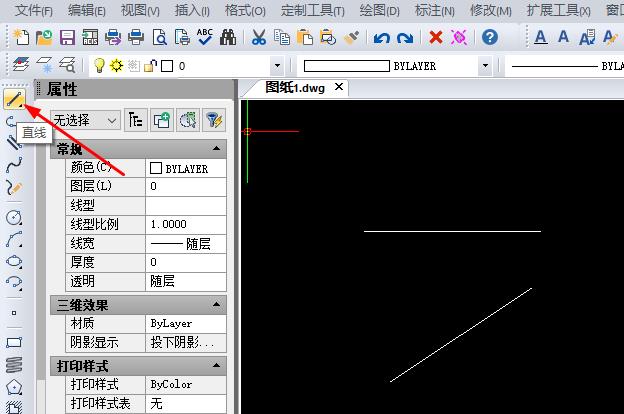 第二步:在其绘制的图形当中,斜线与直线标注尺寸的方法有所不同。这里我们可以利用界面左侧绘图工具图标在图纸上简单绘制出直线、斜线。当然在命令中输入指令同样可以。