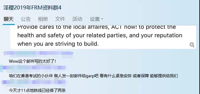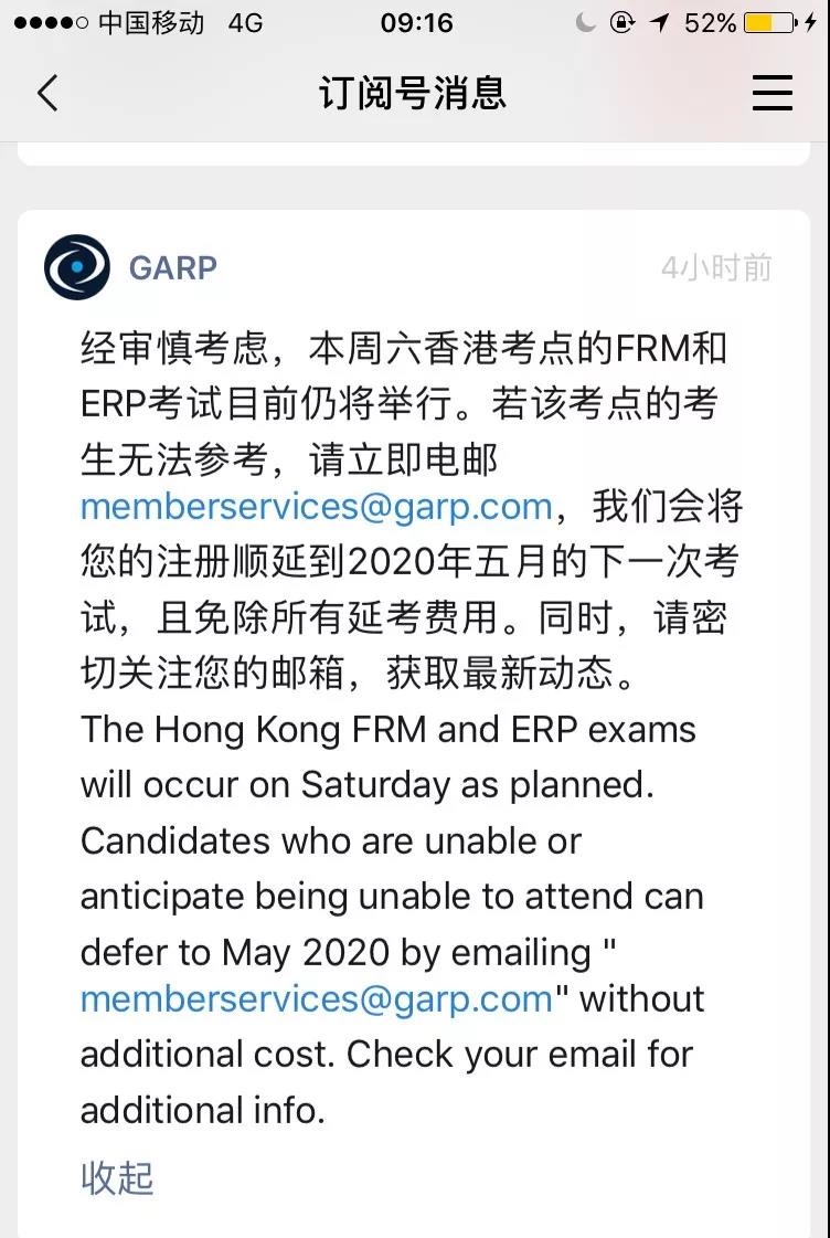GARP非常重视考生的安全。我们正在密切注视香港的情况。到目前为止,考试的日期和时间没有变化。然而,如果有任何变化,在周五会通过电子邮件通知您。在未来几天请密切关注GARP发给您的电子邮件的任何信件。如果您有任何其他问题或担心,请联系GARP。