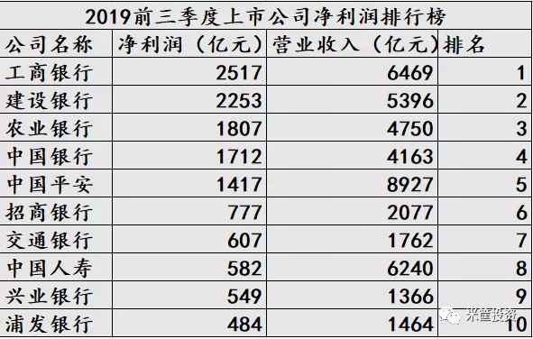 银行和保险占据2019前三季度上市公司净利润排行榜前十名!