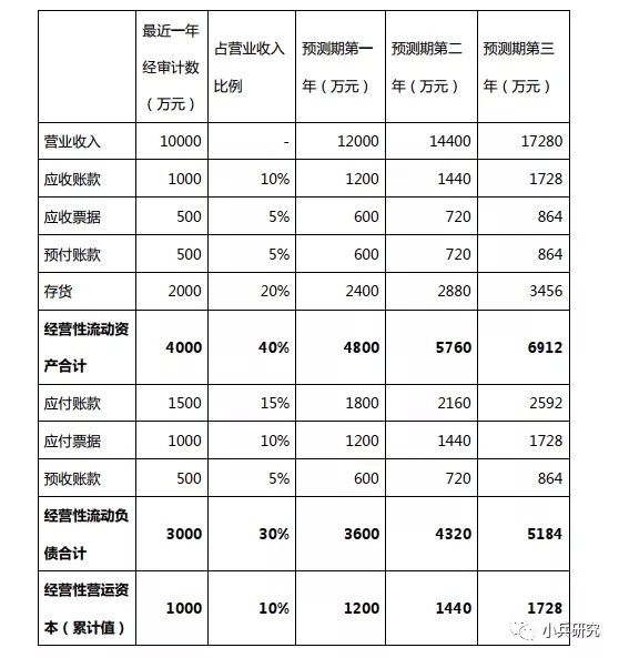 比如,假设预期未来三年营业收入每年增长20%,按以上方法计算营运资金需求: