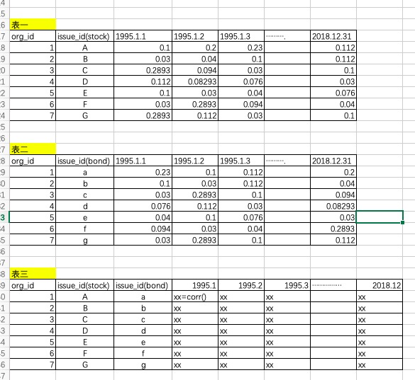 如图所示,我有表一和表二两张表,分别是产品ABCD和abcd的daily return。我如何把同一id的Aa,Bb等产品的monthly correlation算出来呢。最后想得到一张如表三的内容。xx是monthly correlation。跪谢大神!!