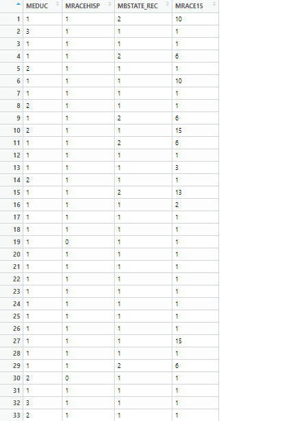 琥珀川lz 发表于 2019-11-16 15:16 data% group_by(MEDUC,MBSTATE_REC,MRACEHISP,MRACE15)%>% summarise(n=n(),percent=n/sum(MEDUC)*100),我 ...