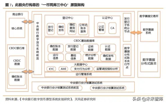 央行数字货币系统主要包括登记中心、大数据中心和认证中心。登记中心主要记录已发行数字货币的归属情况;大数据中心负责在分析支付行为,在特定条件下做到 KYC 和 AMI;认证中心负责储存系统中的密钥对,做到对数字货币和参与方的认证。