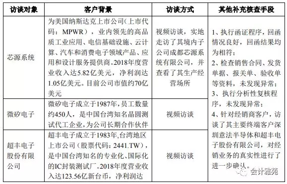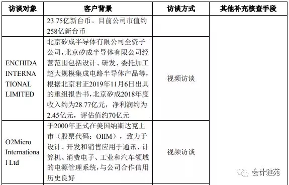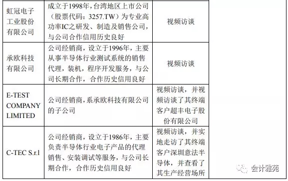 报告期内,公司对境外客户(含经销商客户)芯源系统、微矽电子、超丰电子股份有限公司、ENCHIDA INTERNATIONAL LIMITED、O2Micro International Ltd、虹冠电子工业股份有限公司、承欧科技有限公司(经销商)、E-TEST COMPANY LIMITED(经销商)、C-TEC S.r.l(经销商)进行了视频访谈,被访谈对象主要为境外上市公司或公司长期合作客户,资信水平较高,合作历史良好, 具体情况如下: