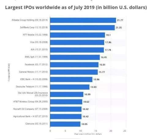 此前全球最大规模的IPO由阿里巴巴摘得。2014年9月,阿里巴巴于纽约证券交易所上市,IPO融资规模达250.3亿美元,创下全球IPO融资规模纪录。