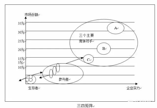 三四矩阵是由波士顿咨询集团提出的。这个模型用于分析一个成熟市场中企业的竞争地位。
