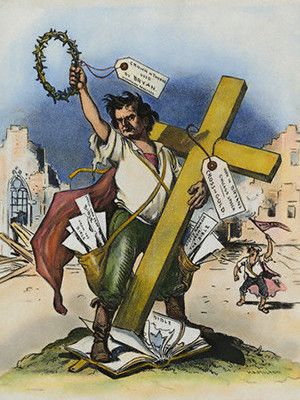 1896年,格兰特·汉密尔顿创作的一幅政治漫画,讽刺布莱恩和他的“黄金十字架”演讲。