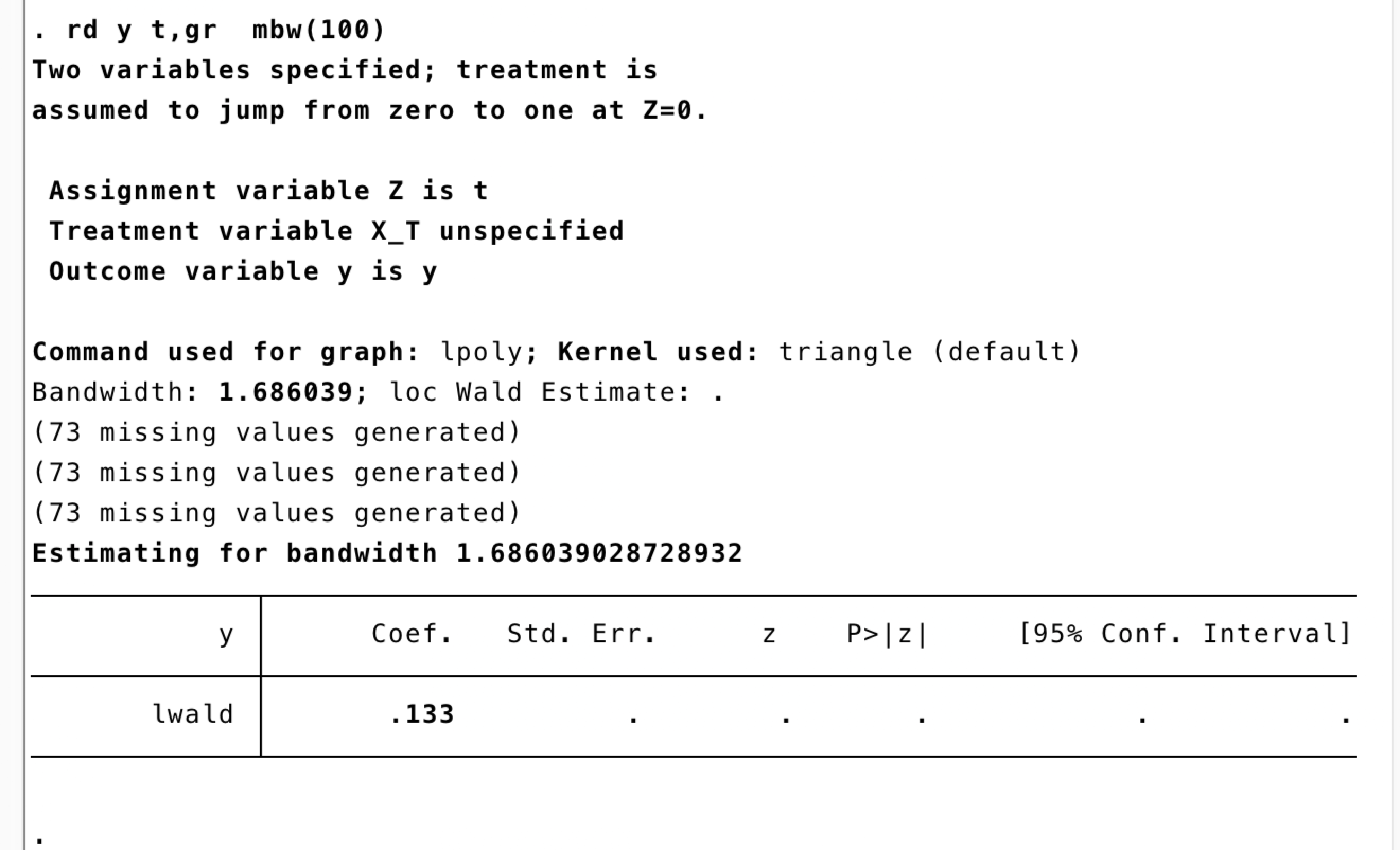 尝试用RDD来分析中美贸易战前后的贸易影响,201804为0 03为-1 05为1 在使用最优带宽进行精准断点回归的时候,产生了无效变量