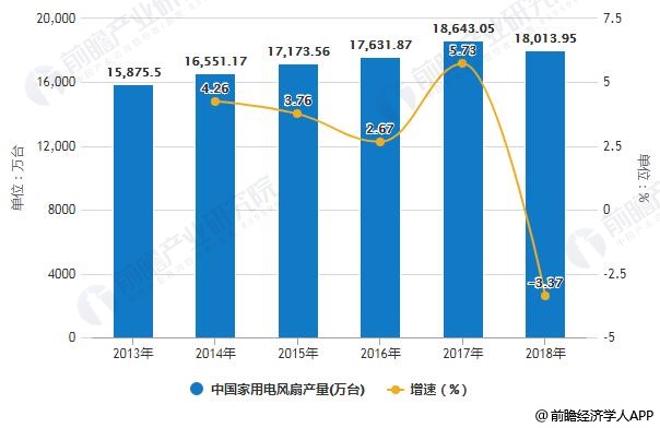 根据国家统计局数据,2013-2017年中国家用电风扇产量逐年上升,2017年中国家用电风扇产量达到18643.05万台,同比增长5.73%;2018年中国家用电风扇产量为18013.95万台,同比下降3.37%。