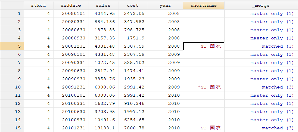想要删除ST年份的所有季度的数据,stata怎么写命令呢?