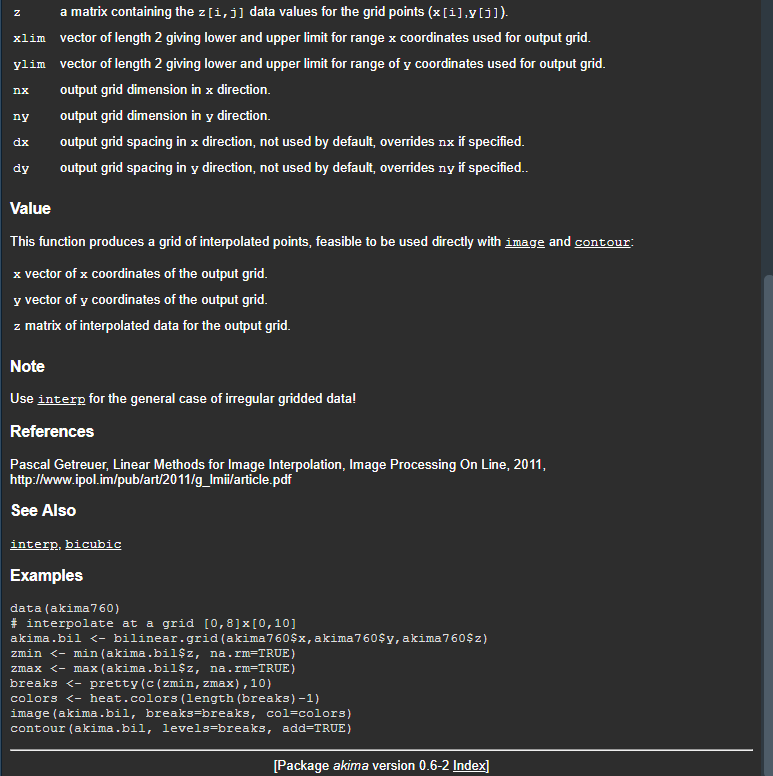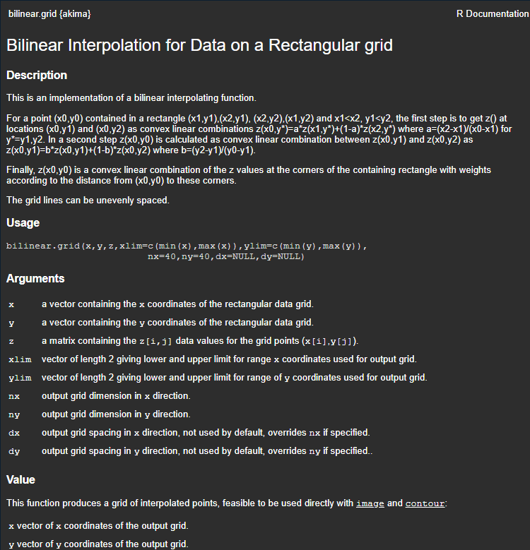 选择使用akima包的bilinear.grid函数进行双线性内插。