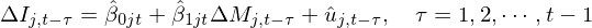 对于可预期的 income change,Ball and Brown (1968) 构建了一个时序回归模型。在第 t 年、对于公司 j,使用过去 t - 1 年该公司的 income change 作为被解释变量,使用除该公司之外的市场平均的 income change 作为解释变量(下式中的 ΔM_{j, t-τ}),进行回归求出回归系数。