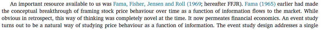 虽然在发表时间上晚了一年,但我们都知道金融学领域发个文没个一年(有时甚至几年)是下不来(Fama 自己也说,Fama et al. 1969 这篇文章投出去之后杳无音信),因此发表时间往往非常滞后于研究发现。由于这两篇开创性的文章都来自芝加哥大学,因此 Ball 和 Brown 的研究也得益于 Fama et al. (1969) 中的方法论;而 Ball and Brown (1968, 2019) 这两篇也都给了 Fama et al. (1969) 足够的 credits。