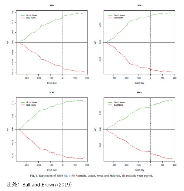 下面四张图则显示了同样的方法论应用于澳大利亚、日本、韩国以及马来西亚市场的结果。Ball and Brown (1968) 的发现被完美的复现在了其他国家。