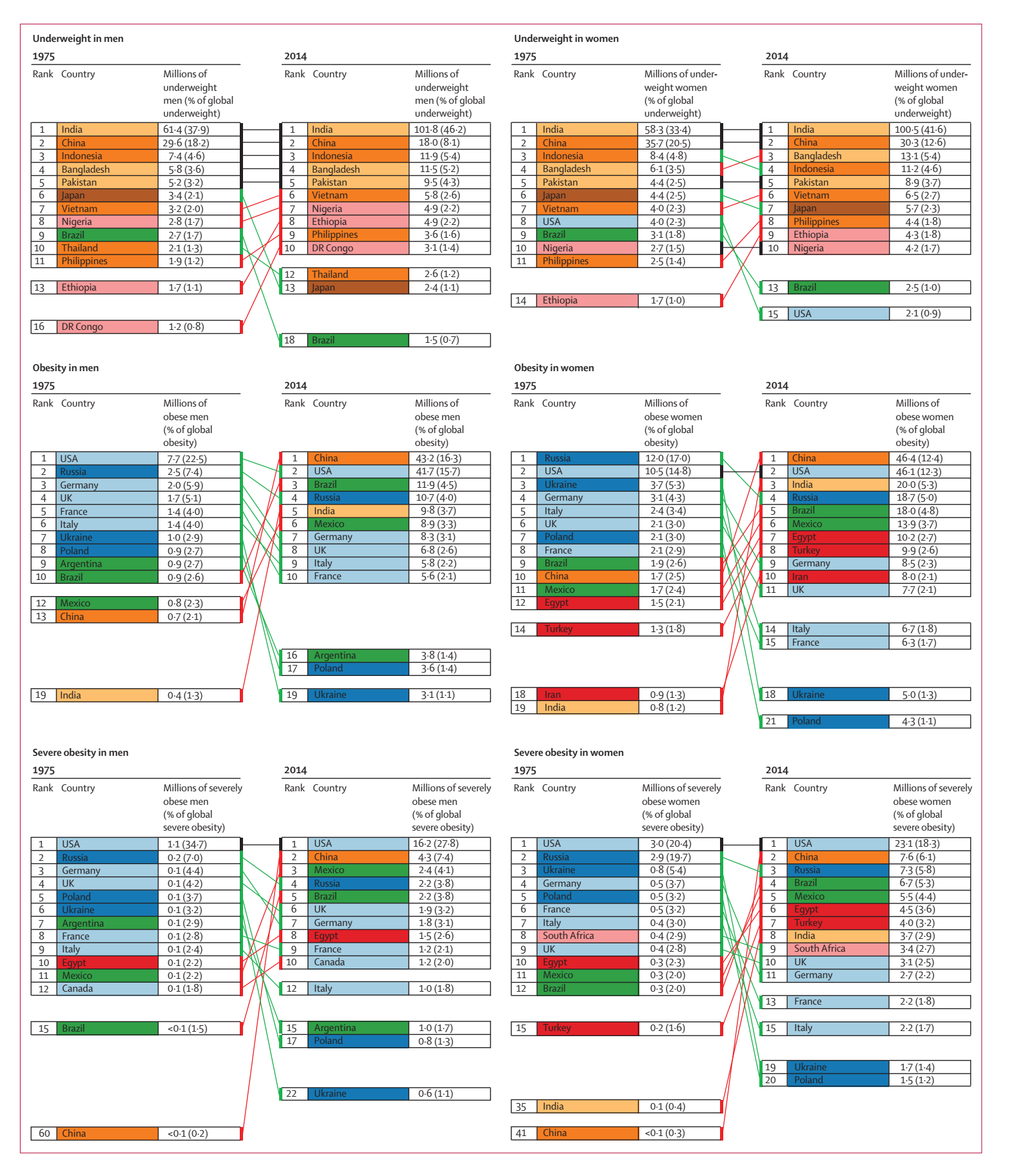 2016年,《The Lancet》上发表了一篇来自英国科学家Majid Ezzati领衔的联合研究报告,其利用基于1689个群体为基础的数据源,对在1975-2014年的期间,近200个国家,超过1920万的成年人(其中990万男性,930万女性)进行分析。该研究发现,在40年期间,全球男性肥胖人数由1975年的3.2%上升至2014年的10.8%,肥胖女性则由6.4%上升至14.9%。数据显示,中国已成为世界“肥胖大国”——中国轻微肥胖以上的男性和女性人数总和已经超过美国,成为世界第一位;在重度肥胖的人口中,中国男性在1975年世界排名为60位,女性排名41位,而到了2014年的数据显示两者仅居于美国之后,均已位列世界第二。因此,通过最简单的方式——运动来提高国民的身体健康意义非凡。