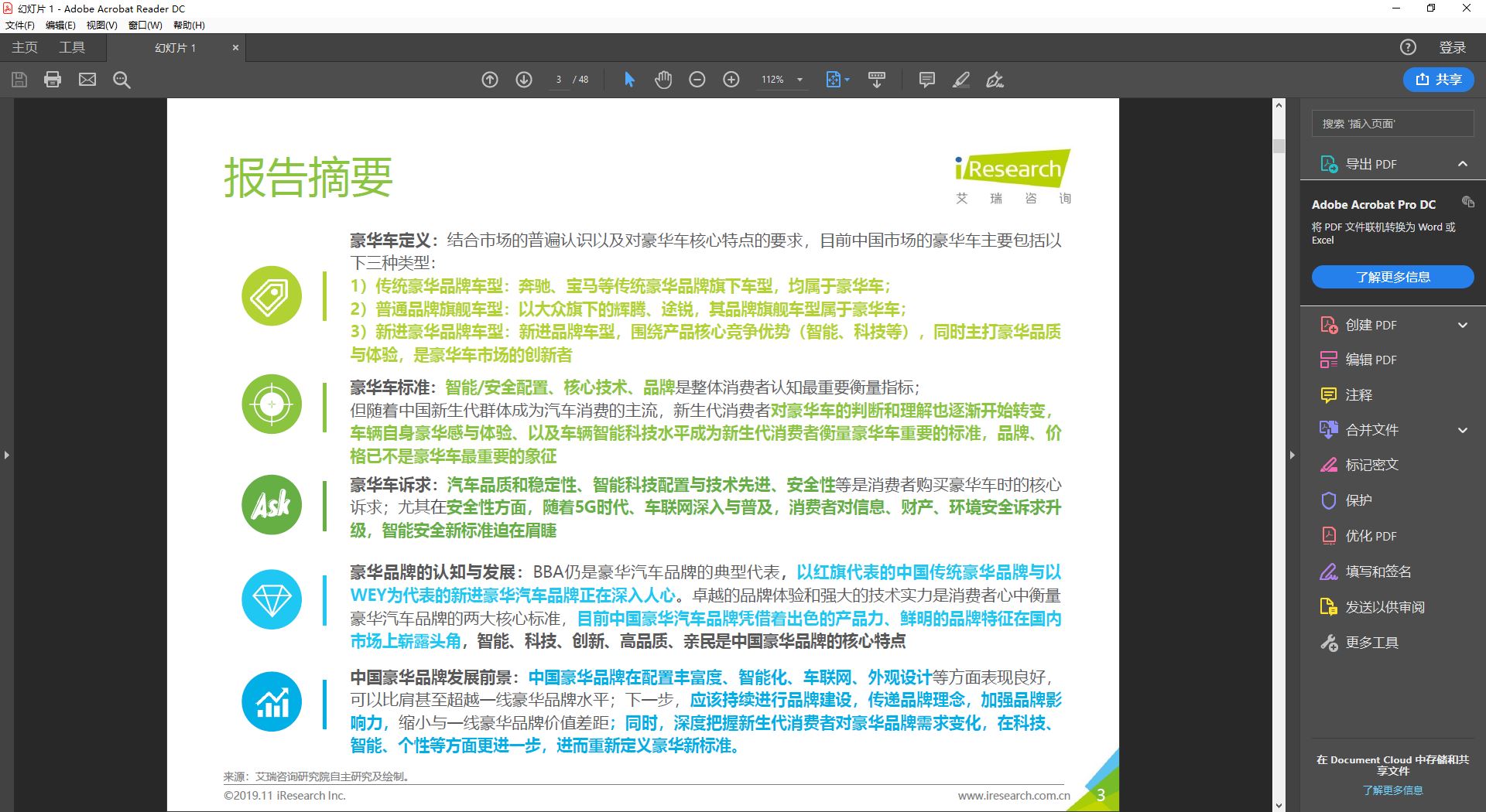 《2019中国豪华车市场发展白皮书》是艾瑞咨询联合WEY品牌发布的报告——调研不仅使用了传统的用户座谈会、媒体及专家深访、线上调研等多种研究方法,更采用了“树标杆&场景化”的创新调研形式,全面了解消费者在购车、驾驶等场景下对豪华车的真实评价、需求与反馈。并从不同年代消费者角度探索其对豪华车的态度及需求变化,洞察中国豪华车市场的变化特征及未来趋势。