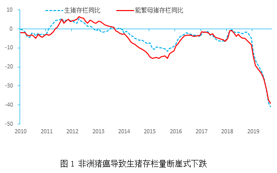 “非洲猪瘟”的影响是毁灭性的。“非洲猪瘟”是一种死亡率极高的猪瘟。生猪一旦感染,死亡率接近100%。根据农业部数据,自2018年8月爆发“非洲猪瘟”疫情以来,全国的生猪存栏量和能繁母猪存栏量开始出现断崖式下滑。
