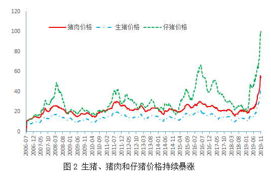 生猪存栏量短时间内大幅下跌,对猪肉价格形成了巨大的供给冲击,生猪价格持续暴涨。2019年10月,22省市平均猪肉价格和仔猪价格均再创历史新高。