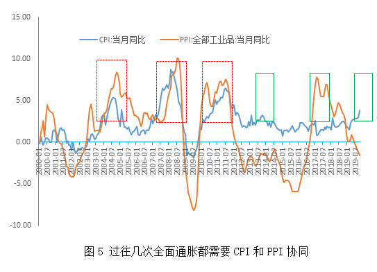 (2) 从经济周期位置来看,过往三次全面通胀都发生在经济上行周期中,表现为CPI和PPI协同向上,而本次物价上涨发生在经济下行周期中