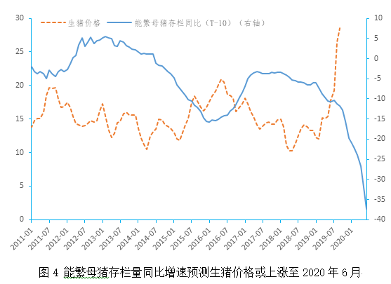 过去经验规律也能佐证上述判断。过往数据显示,能繁母猪的存栏同比大约领先生猪价格同比10个月。如果历史经验规律仍然有效,基于当前的能繁母猪存栏量数据来看,生猪价格至少还要上涨到2020年6月。