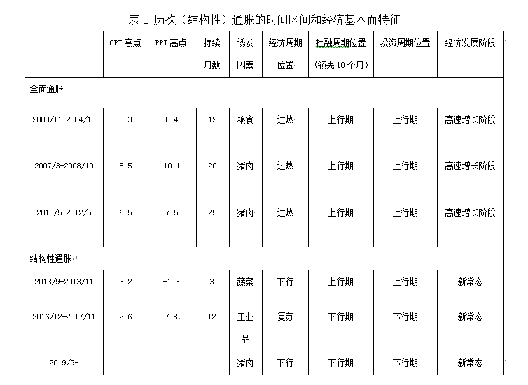 表1列举了历次通胀区间的经济基本面特征。的确,此次CPI破3和过往三次全面通胀有一些共性。这几次通胀都是从农副产品涨价开始。而且过往三次全面通胀的两次是猪肉价格暴涨开始,这次也是如此。但本次通胀发展变化的经济基本面特征和过往三次全面通胀时期有着明显的不同。