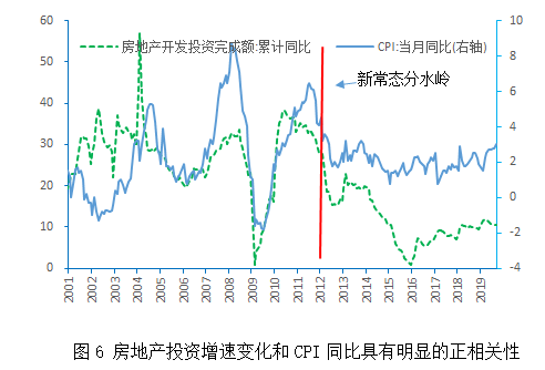 以住房需求为例,在经济高速增长阶段,住房需求旺盛支撑了房地产投资的高增速,而房地产行业带动的上下游需求巨大容易推升总需求,推动全面的物价上涨。在经济进入新常态后,住房需求已经大部分得到释放,房地产投资增速也逐步放缓,增速中枢明显下移。图6展示了房地产投资和CPI的这种正向动态关系。