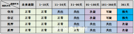 目前国内多数银行、互金根据金融办的相关要求,对资产逾期情况的分类——具体的资产的五级分类如下: