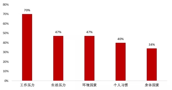 除了工作时间过长,休闲娱乐和睡眠时间就相应减少。此外工作压力过大导致的睡眠问题也成为普遍现象。根据第一财经商业数据中心公布的数据,中国互联网网民中有56%表示自己有睡眠问题。而工作压力大成为网民失眠的最大原因,其次为生活压力和环境因素。
