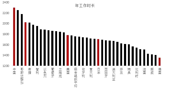 根据2008年《关于职工全年月平均工作时间和工资折算问题的通知》中每年250个工作日计算,即使是周平均工作时间46个小时,将相当于年工作时间为2300小时,这远超OECD国家的平均数,约相当于上世纪70年代初日本的水平。更值得关注的是,