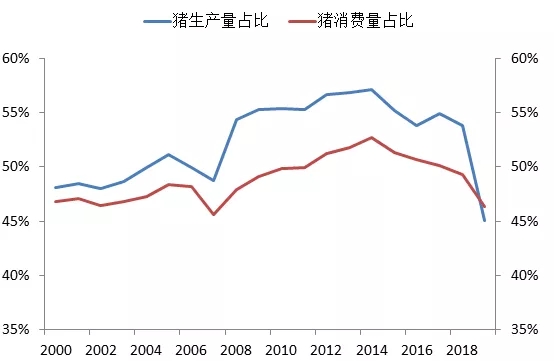 由于受猪瘟持续蔓延、环保要求提高和上一年存栏率下降等诸多因素影响,2019年我国的猪产量占全球的比重,从2018年的53.8%大幅下降至45%,这也是导致猪价大幅上涨的原因。