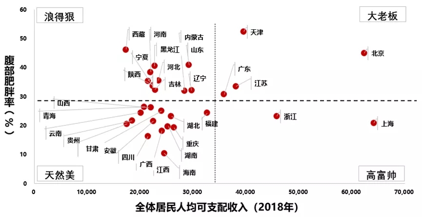 仅有上海与浙江,收入水平较高,但腹部肥胖率偏低,身材保持较好