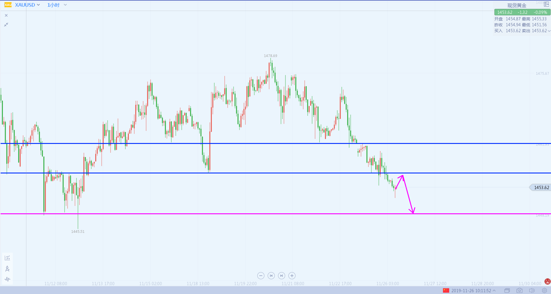 1:黄金反抽1456-1457做空,损在1462.5,目标看向1448。