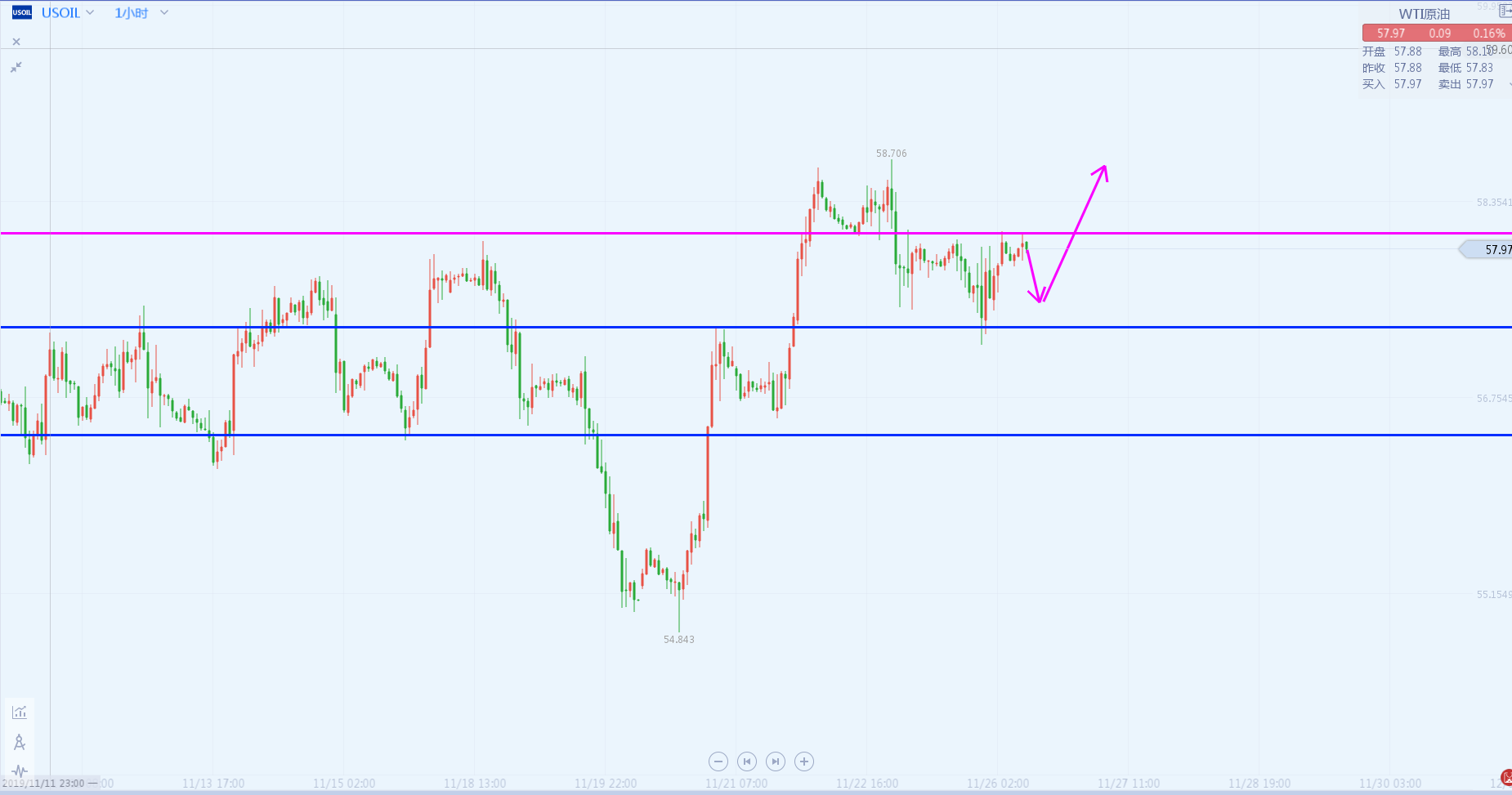 2:原油回撤57.5做多,损在57,目标看向58.4。