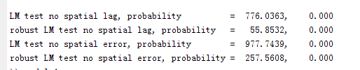 fprintf(1,'robust LM test no spatial lag, probability = %9.4f,%9.3f \n',robustLMlag,1-chis_prb(robustLMlag,1));