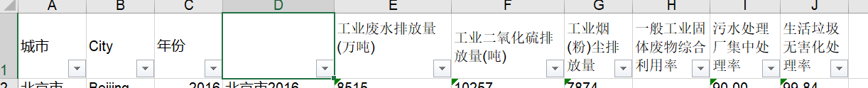 环境指标包括:工业废水排放量(万吨),工业二氧化硫排放量(吨),工业烟(粉)尘排放量,一般工业固体废物综合利用率,污水处理厂集中处理率,生活垃圾无害化处理率