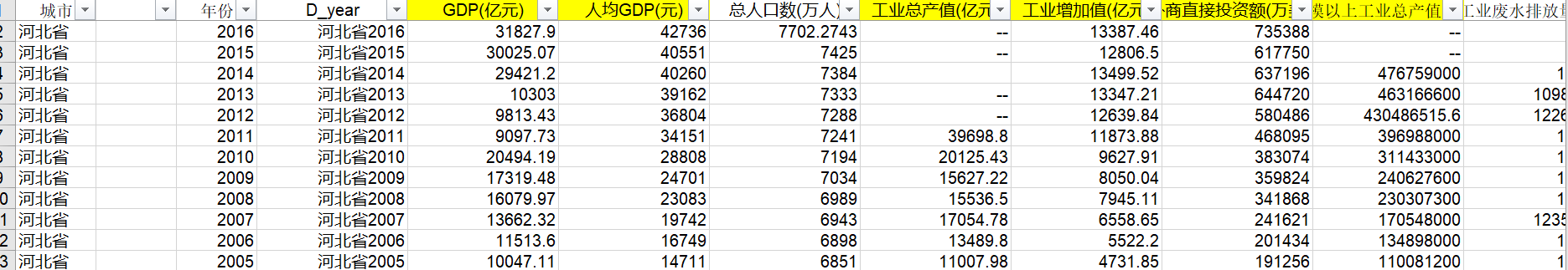 经济指标包括:GDP(亿元),人均GDP(元),总人口数(万人),工业总产值(亿元),工业增加值(亿元),外商直接投资额(万美元),规模以上工业总产值(万元),进出口总额(万美元),出口总额(万美元)