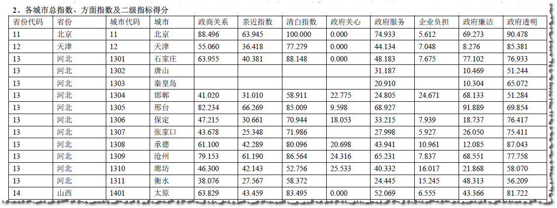 中国城市政商关系健康总指数、方面指数及二级指标得分(2017).xls
