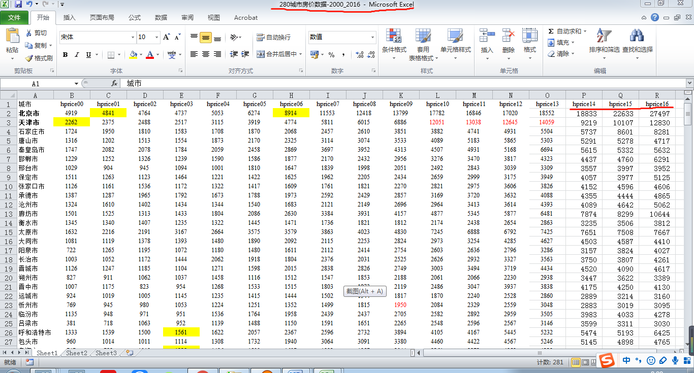 因写论文需要,整理出280个地级以上城市2000~2016年的住房价格数据。需要说明的是,根据《中国区域经济统计年鉴》,只能获得2000~2013年的住房价格数据。因此,基于该年鉴的数据,只能研究2000~2013年的房价。为更好地了解2013年以后各城市房价变化,本人还整理了2014~2016年的各城市房价数据,