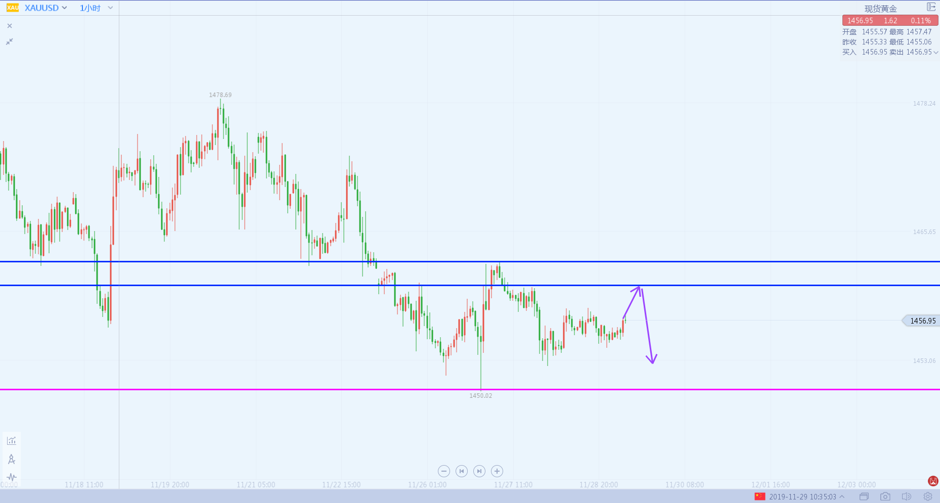 黄金如图,既然波动不大,就没必要冒进,等一个关键性的位置做一次即可,上方压力1460,下跌,最后一次拐点位置1464,在整体低位震荡时暂时没有做多的理由,操作依然是以空为主,价格反抽1460空一次,防守在1465,目标看向1452,其他位置暂时不考虑。
